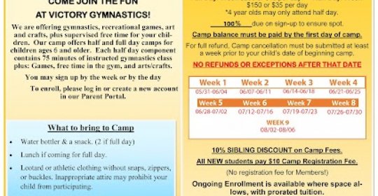 Fantastic experience: My daughter has been a gymnast at victory for over 4 year. Part of the reason she loves gymnastics is becuase of this gym. The staff and coaches are outstanding! If your child is interested in gymnastics i would absolutely recommend Victory